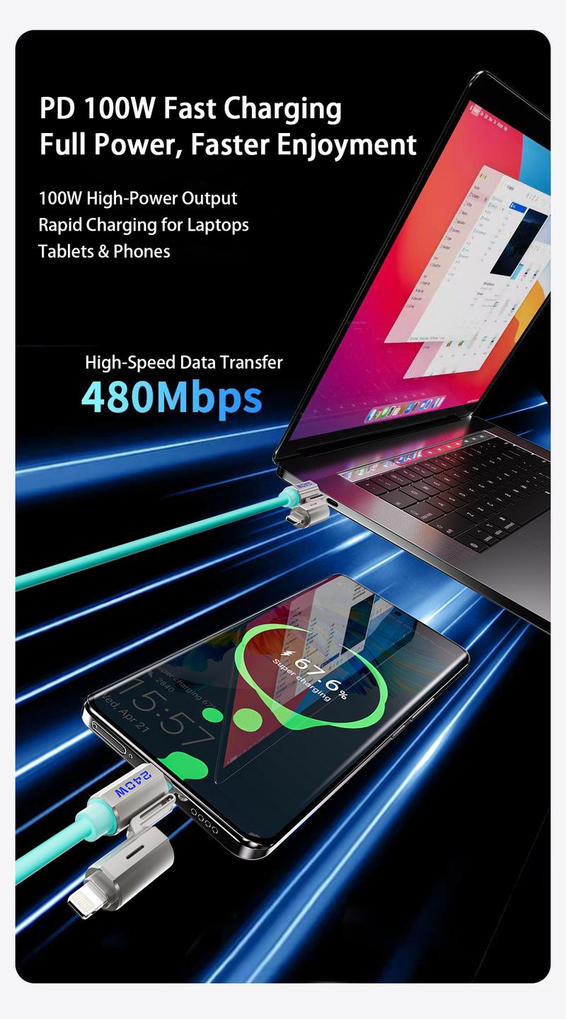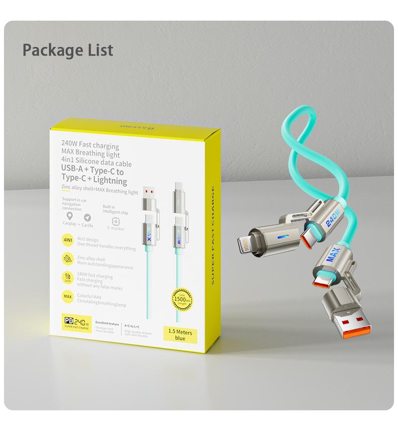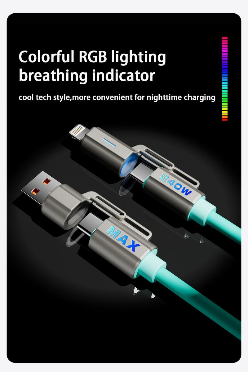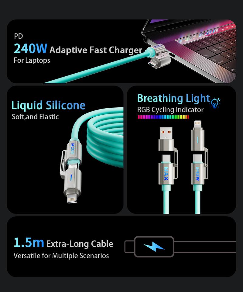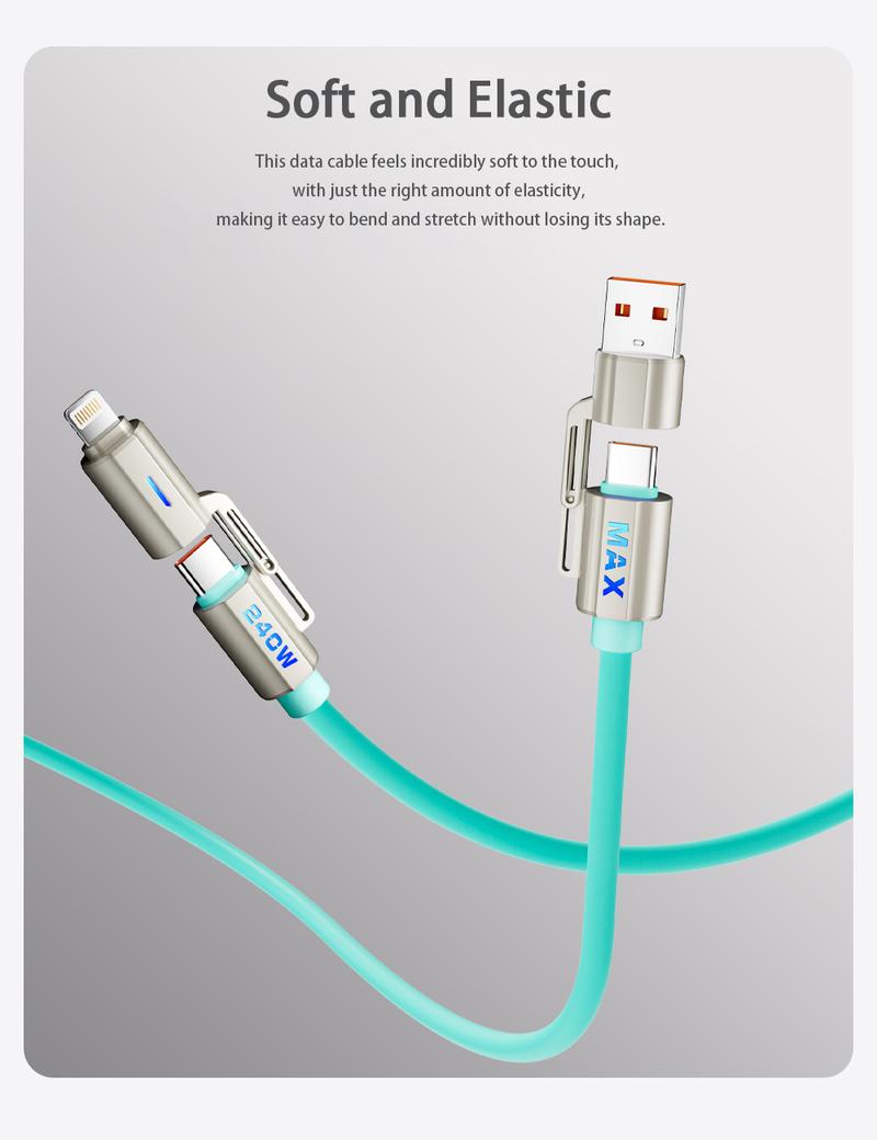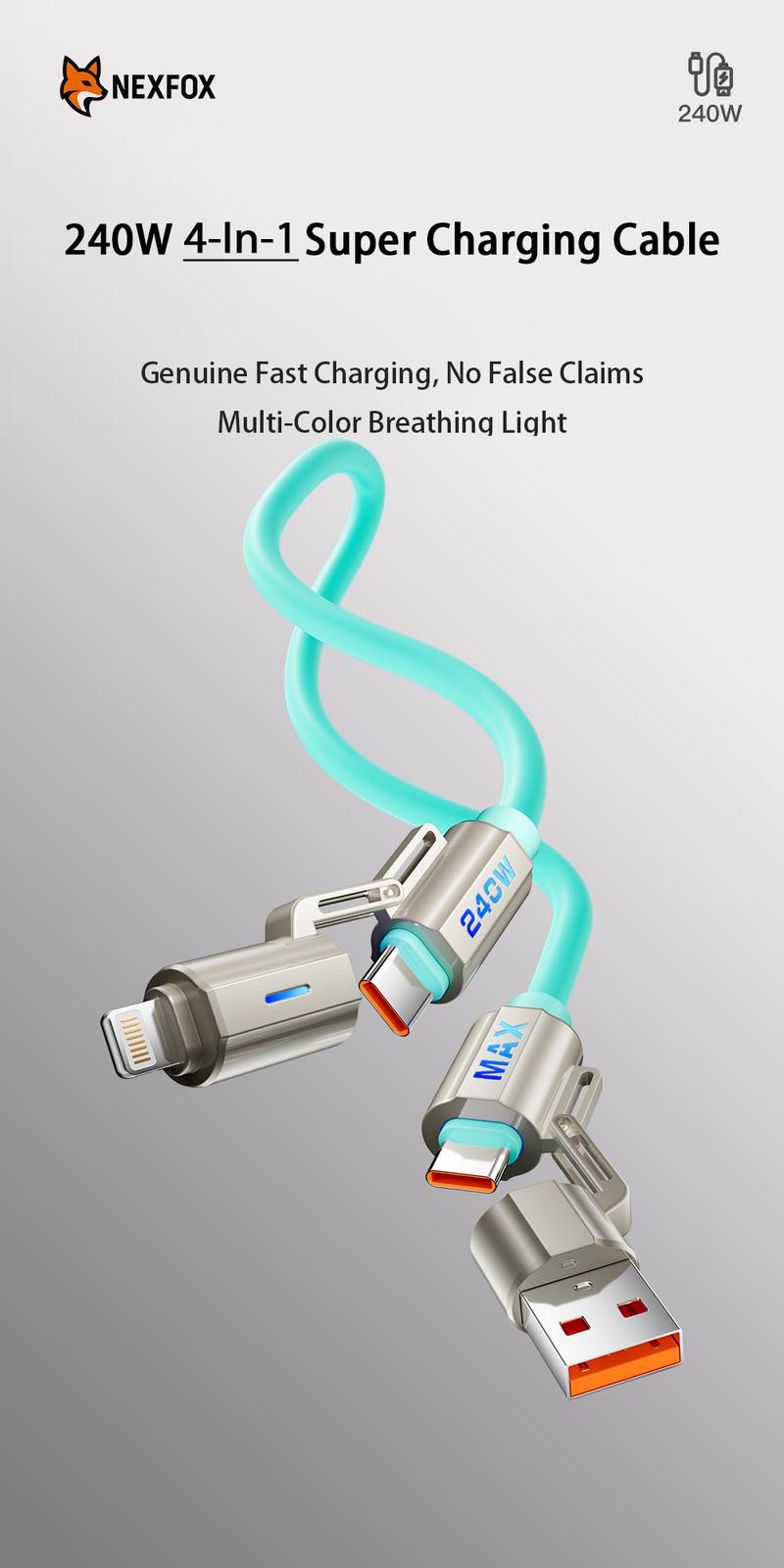 NEXFOX 4 in 1 Liquid Silicone Data Cable 240W Fast Charging for Iphone 17 & Android Devices with USB a Type C & Lightning Carplay Android Auto